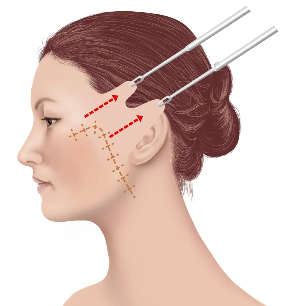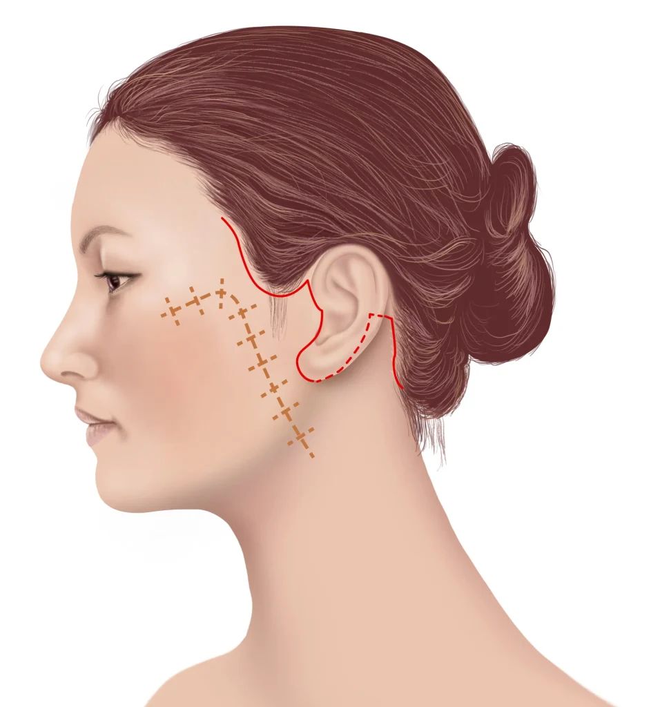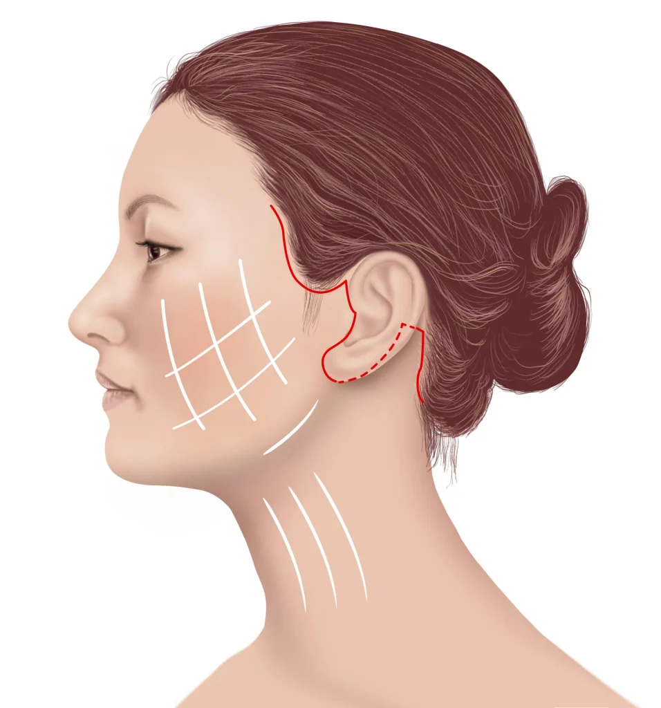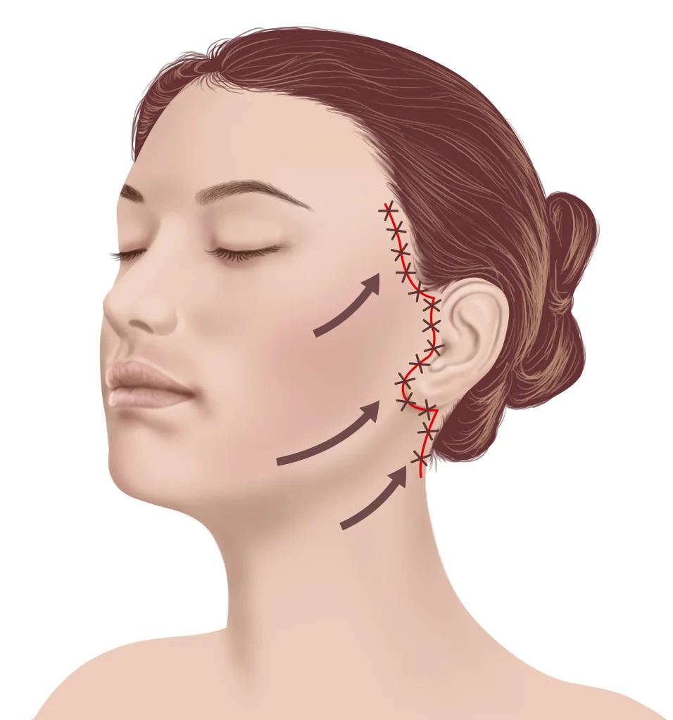 顔の皮膚の支持組織であるスマスと呼ばれる表在性筋膜を処理し、強固なリフトアップ効果を得ます。内側ではスマスの短縮縫合を、外側ではラテラル・スマセクトミーを行い、しっかりと引き上げます。場合によってリテイニング・リガメントを切断し引き上げ効果を増します。余った皮膚を切除し、形成外科的縫合を行います。